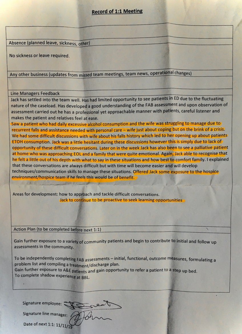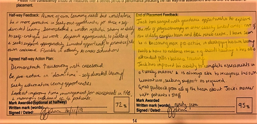 An aspect of care throughout placement that became apparent was the role of other professions in health and social care (2). This first became a topic of importance when it was introduced within our interprofessional collaboration module, I have since developed this in practice by spending time with other healthcare professions, such as; complex care of the elderly, rehab centres and district nurses (evidenced in Placement 3: Feedback – right) and being involved within MDT meetings (evidenced in Complex Situation Reflection, highlighted in blue – right). These experiences have allowed me to understand my role much clearer and facilitated me working more effectively within a team to make appropriate referrals when required, enabling me to build and sustain professional relationships, in addition to demonstrating my own identification of my own development needs and taking appropriate action to address these (2,5).