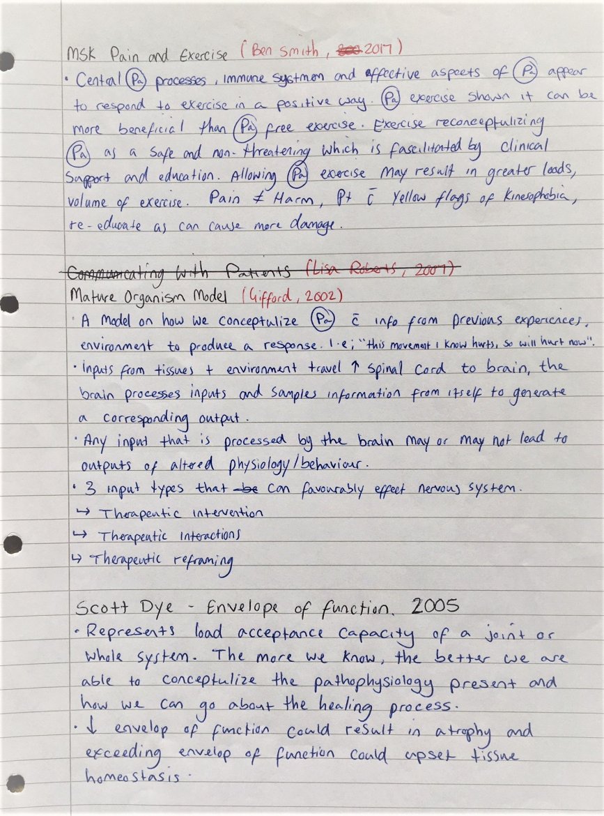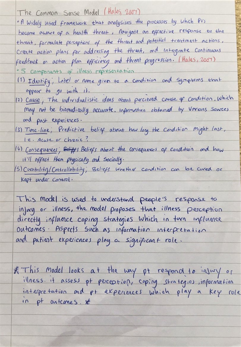 An essential requirement laid out by the HCPC for physiotherapists to enabled them to register is to have an understanding of the key concepts of the knowledge base relevant to the profession (1). I previously completed a BSc in Sports and Exercise Science in which I built and developed my knowledge on the structure and function of the human body; broadening my knowledge within musculoskeletal anatomy, in addition to furthering my understanding of less familiar areas of the human body such as the respiratory and the neurological system in an detailed manner (evidenced Anatomy Certificates, Neuro Anatomy and Pathology and Respiratory Anatomy and Pathology notes – right), where I have been able to consolidate this knowledge during my neurology viva (evidenced in neuro viva feedback – right) (2). In addition to this, I have had the opportunity to develop and extend my understanding of the scientific bases and the theories underpinning physiotherapy practice; my previous conception of physiotherapy was that it is a very biomedical profession, however, now I have developed a strong understanding of the value of a biopsychosocial approach, education and advice (3). This knowledge has been developed through reading and note take to consolidate my knowledge of theories such as Gifford’s mature organism model which highlights the importance of a patient’s own and societal beliefs of injury and illness through previous experiences (3) and Hales common sense model which takes into consideration how a patient may respond to injury or illness and how they interpret key factors may influence outcomes (evidenced in Theories of Practice Notes – right) (4). This reading and note taking has enabled me to re-think my approach and to consider a mix of biological, physical, clinical and behavioral methods for each individual patient (3). This new found knowledge and understanding to different approaches has allowed me to consider each person as a whole rather than just the condition they present with. This demonstrates my commitment to putting service users at the centre of decision making, which is a requirement of the CSP (5) and adapting practice to meet the needs of different groups and individuals, a pre-requisite of the HCPC for physiotherapy registration (1).