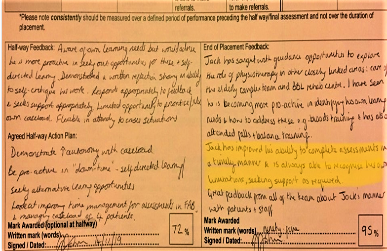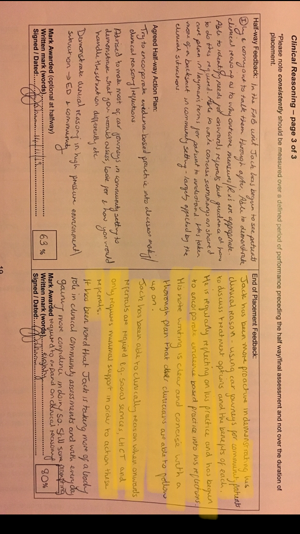 Critical reflection and evaluation on practice is a key concept stated by the CSP (1), and is an aspect of practice that was alien to me on my initial introduction to utilising this in practice. However, this is something that I had to learn to effectively do during and after placement. Initially my reflections considered my actions and the feelings that followed my actions an did not adequately delve deeper into my own values and preferences, however I was able to identify my limits as my Scope of Practice Feedback suggests. The Placement Feedback I received evidenced me using reflection in an evidence-based manner which I believe allowed me to develop skills to understand my scope of practice through understanding when to correctly refer onwards to other services (Placement Feedback – right). My SWOT Analysis From Placement 2 and Observational Week SWOT Analysis both suggest I was “shy in new environments” and that I “try to please everyone” causing me to try to adopt 2 different methods of doing the same task during an assessment through the indifferent feedback I was getting between 2 different placement educators. I soon came to the reality that I could not continue in this manner and decided to have a discussion with both me educators about this (highlighted in SWOT Analysis From Placement 2), which I believe shows my honesty and integrity (2) towards myself and my educators for the benefit of my assessments towards patients.
