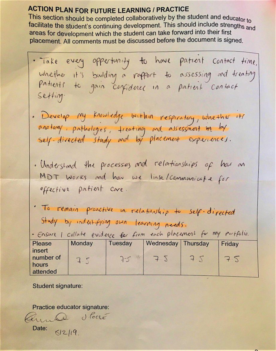 Through my reflections and placements, amongst realising my weaknesses, I also understood my strengths. My Observational Week Action Plan helped me to realise that I must remain driven and enthusiastic to continue to learn throughout my course, I believe this is be one of my personal values and have strived to do this by staying up to date with recent event within the world by completing an online course to help me understand Covid-19 (Covid-19 Online Course) showing that I have tried to embody my fulfilment to duty of care (7) to understand what I can do to help when the time comes, and this is something that I will strive to do throughout the rest of my course, and my career as a physiotherapist.