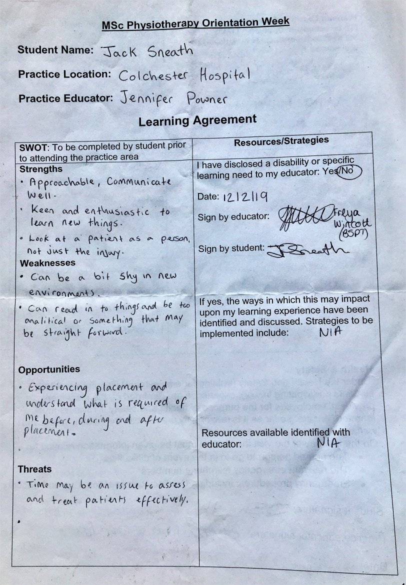 In my SWOT Analysis From Placement 2, I view myself as someone who is punctual and completes tasks in a timely fashion, and this is something that I try to embody as one of my personal values. However, my conscientious nature (SWOT Analysis From Placement 2 – right) can and has lead to me not necessarily gaining as much information as I would like with a patient, leading to me over-running during assessments, which I believe demonstrates my awareness of my personal values and an understanding of how these influence my behaviour and practice (2). Furthermore, I did reflect and highlight that I have a preference for a structure during assessments with patients to ensure I obtain all relevant information as this is how I liked to conduct an assessment to maintain control over the conversation. Although this does highlight a weakness to some degree over having a lack of authoritativeness to re-direct the conversation back on topic. This is something that I have reflected upon (SWOT Analysis From Placement 2 – right) to ensure I develop my subjective skillset and maintain being timely and punctual as a key personal value while being flexible with each patient I treat going forward into my career as a physiotherapist. This is something I believe I managed to do on a placement 4 where I was able to be timely with assessments, maintain control over the conversation and most importantly, explore the patients own beliefs using Gifford’s model (3) (evidence - End of Placement 1: Reflection – right) which is something I have adopted as a personal value and I believe this allows me to build stronger relationships with patients (4,5), demonstrating again my ability to understand how my behaviours influence my practice, in addition to meeting HCPC criteria of being able to reflect and review practice (6).