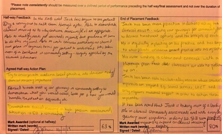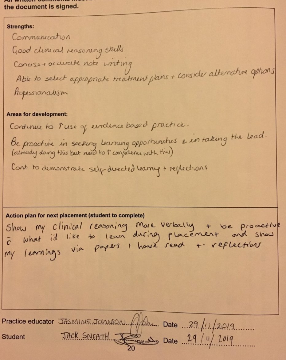 Throughout the course, it became very apparent that teamworking and supporting others through assisting, learning and teaching of practical skills was pivotal for success. However, we had the opportunity to assist with learning and teaching of written skills as well where we were given an assignment of one of our cohort to mark and give feedback on. This was a new concept for myself but this was something I wanted to get right, as a result of this I was able to give feedback to them (See – SE720: Peer Feedback), as to which infers that I was able to with guidance and predetermined criteria, I was able to assess a learner’s performance and progress and provide appropriate feedback (4). In addition to being able to being able to assist others learning and development, I have been able to proactively reflect and progress my own practice. During placement 3, I discussed with my educator two topics that we wanted me to achieve, which was clinical reasoning and evidence-based practice, which are fundamentals of good physiotherapy practice (5) and onwards referrals when appropriate. Sitting down with my educator allowed me to reflect on learning and teaching performance and using this evaluation to inform my own practice, and as a result I receive positive feedback that these elements were enhanced during my end of placement feedback compared to my mid-way (See – Placement 3: Feedback) which allowed me to reflect on this to inform my future practice within the areas of development and action plan for next placement section of end of placement paperwork (See Placement 3: Action Plan) (4). This will be something that I shall strive to do throughout my physiotherapy career in order to help myself, and the others I work with progress as clinicians which will may have a positive impact on physiotherapy practice as a whole.