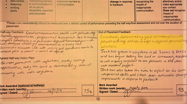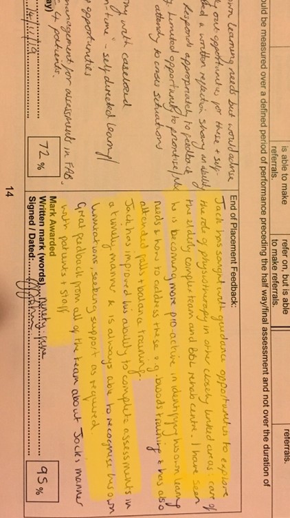 During our practical exam practices and placements, I noticed that there is not a one size fills all approach, and as a healthcare professional, I must be adaptable in relation to behaviours and actions during different situations and environments that I will inevitably be placed in during a career in healthcare (2). Adaptability can come in many forms but a key modality that I was aware of was communication. My first insight into adapting my communication was during peer coaching during our Musculoskeletal module in our first year, this highlighted to me the importance of our non-verbal communicative techniques which has been reported to equate to 55-97% of the message we deliver (3), highlighting its importance. I took it upon myself to further understand this concept and how I can adapt this idea into my own practice (evidenced – SE701: Reflective Statement), where I was able to adapt my actions in response to the demands of the situation during practical MSK assessment practice (1). I was able to look at my own practice and evaluate its effectiveness in regards to my own performance in order to continuously improve, through the realisation that the utilisation of the non-verbal communicative techniques I portray can have a large influence on my clinical caseload(1,4,5). Furthermore, the skills I had reflected upon during my SE701: Reflective Statement permitted me to transfer them into clinical practice where I was able to be adaptable in my personal behaviours and actions in response to the demands of different situations with staff and patients alike (evidenced – Placement 3 Feedback), demonstrating my ability to implement this domain effectively (1), something that I shall continue to invest in during my career as a allied healthcare professional.