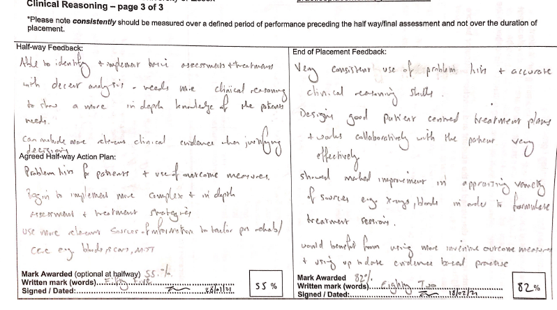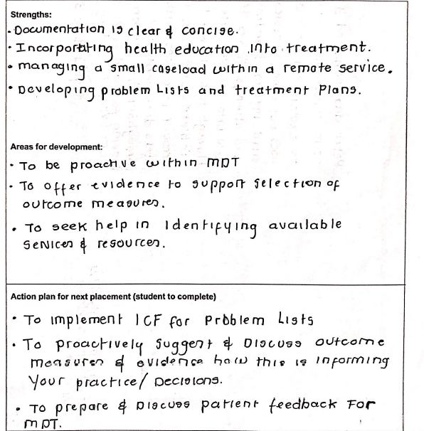 A physiotherapist must act with honesty and integrity to their employer and the patient to maintain high standards (4). I have attempted to achieve this through being honest in my evaluation of my own strengths and weaknesses while on placement, and throughout the course of my study. This is presented here as 'strengths, weaknesses, action plan' and 'reflection'. This allowed my educators and tutors to grade what sort of scenarios they were comfortable with me dealing with. This process has involved me being honest about my practice and demonstrating integrity in discussing negative experiences and weaknesses I had encountered in the past. This is similar to the process of reflecting that I have become familiar with during my time studying. At the beginning of the course - being honest about my own practice was not something I was very familiar with and I sometimes struggled to not only identify areas in my practice for development, but areas of strengths. By routinely completing SWOT analysis (strengths, weaknesses, opportunities, threats) with the guidance of practice educators I have become more confident in identifying weakness but also identifying strengths. Sometimes, an area I still find challenging is planning how to address areas for development. I am able to identify the area but forming a solution often requires some guidance from seniors. My scope of practice has improved that I am now much more comfortable analysing my strengths and weakness and through discussions and reflections with seniors I aim improve my ability to address weaknesses using development plans more frequently. I have included a SWOT and 'PDP' as evidence of my attempts to better myself in this regard.