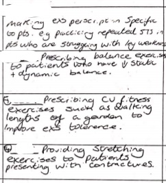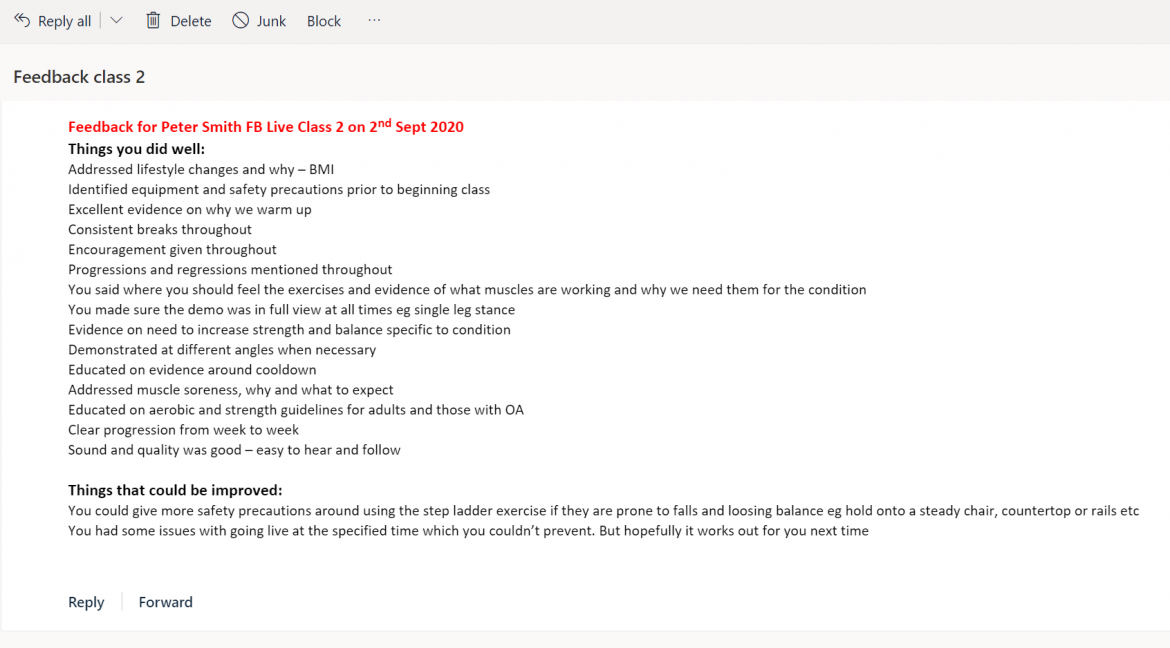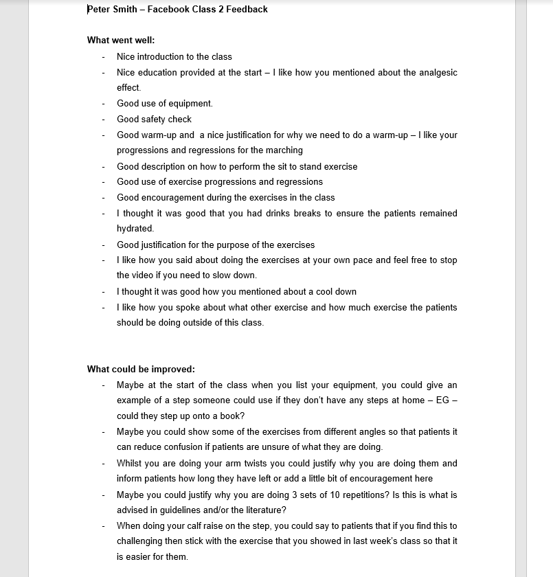 My inclusion of a video of myself, hosting an exercise class with adjoining feedback is to demonstrate my ability to modify a technique in response to feedback, in the area of exercise prescription. These are presented here as 'peer feedback from exercise class' and 'picture of exercise class after feedback'. I believe this to be a strong area of my practice, with regular feedback given from educators that I respond appropriately to feedback. I believe that my ability to adapt to feedback has allowed my scope of practice to grow. This has been evident from many educators who have reported an improvement in my practice following feedback. I have also included a modified 'exercise programme' based on a clients preference, completed during my stroke placement. Once qualified I hope to continue in this regard, but would hope that the more experienced I become, the less feedback I require. To possess these skills is important to maintain fitness to practice and to support the development of physiotherapy.