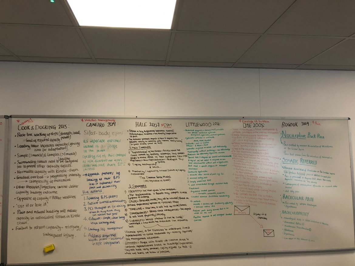 During preparation for our MSK viva exams in first year, our class got together in groups to study various topics. One thing we found particularly challenging, was reading large numbers of articles and being able to summarise. We decided as a group to summarise them together and write our ideas on the whiteboard as this is how most people would best learn (and we could take pictures). We found this the best way to facilitate our learning and development. Presented here is a picture taken of our work 'picture of group learning for MSK VIVA'. I feel this is a good example of applying appropriate approaches to learning and teaching to meet learners needs. Again, I feel this is an important skill to have on graduating and moving through physiotherapy. It will be important to be able to adjust how material is taught based on the audience in order to communicate effectively. For example, teaching material to a band 5, during in-service training will be different to teaching a student on their first placement. If the appropriate approaches are not used the learner may not get the most out of the teaching. I aim to get much more experience in this regard once I graduate, as it is an area I have not had too many opportunities to practice - through providing material for in-service training and getting more involved with teaching students when appropriate.