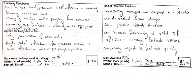 Feedback supports learning and reflection, and prepares an individual for future practice (3). It is important for an individual to be open to feedback, reflect upon it and incorporate it into practice with their theoretical knowledge (4). I believe I have shown an ability to modify behaviour & actions in response to feedback throughout my placements. One example that is relevant to this domain, is feedback received on the management of caseload and delegation which I have presented here as 'placement feedback on caseload management, feedback and reflection'. I believe this is a strong element of my practice and have received praise from a number of educators on my ability to receive feedback and implement it. This has been a strong area of my practice from the beginning, with one main area reported for further development. This was being proactive in seeking feedback from my educators. A big improvement in this was noted personally in my last placement. Presented here to show the improvement is a snippet of the placement feedback, 'placement feedback - initiating feedback'. I hope to continue in my openness to receiving feedback and begin initiating feedback on a much regular basis once I begin as a band 5.