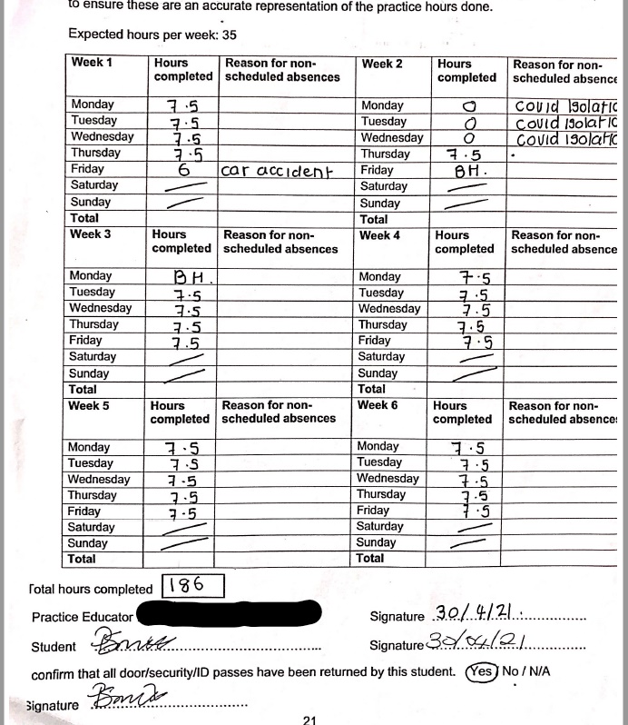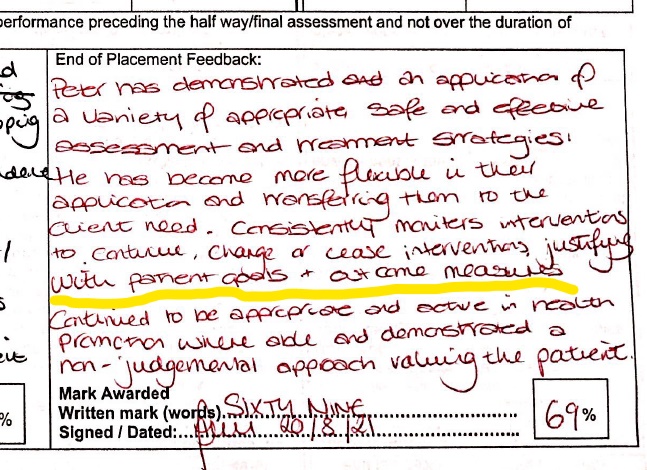 To work as a physiotherapist, importance is placed on the ability to assure the quality of your practice and your commitment to quality of care. Echoing this, the CSP and Public Health England have policies in place to ensure effectiveness, efficiency and quality of a service is maintained (2,3). Firstly, to demonstrate fulfilling requirements of policy and frame work, I have evidenced an example of my hours sign off from placement. This is presented as 'placement hours signed off'. As part of accreditation from the CSP for a pre-registration programme, a student must gain a minimum of 1000 hours of practice based learning (4). By completing my 1000 hours of placement I am demonstrating meeting this requirement. A screenshot is presented 'Total Hours Completed'; as evidence of meeting this. Similarly, before going out on placements, online training modules were required to be completed, these can be seen in 'mandatory evidence' .I have also demonstrated how I have attempted to meet the CSP framework (1) but also the NHS values, HCPC standards and CSP standards throughout this portfolio. By keeping up to date with these various standards, it helps a student/ newly qualified physiotherapists to fulfil the requirements of legal and policy frameworks governing professional practice. Meeting standards is not something I have struggled with. I believe this is due to it being a requirement, so if it is not fulfilled I will not be able to practice.