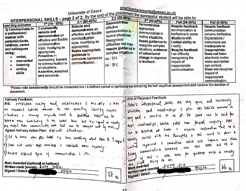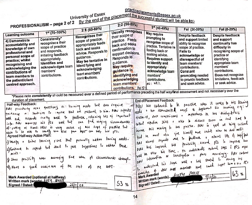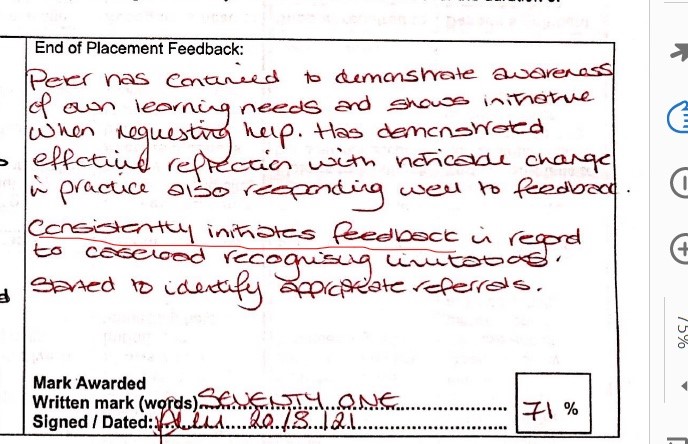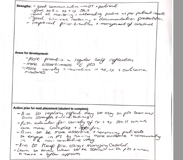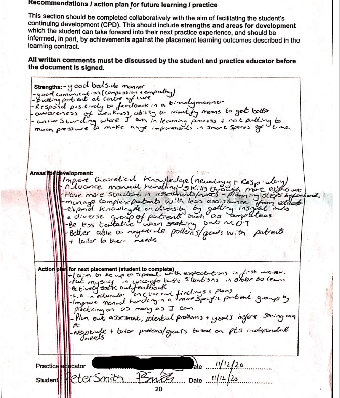 As part of my placement booklet, there is a section which requires reflection on strengths and weakness during each placement. Then with the guidance of my educator, this information is used to inform the development of a future 'action plan'. This entails areas I wish to address on my next placement or when moving to a band 5 role. I also created a personal development plan ('PDP'). Creating this, involved analysing my strengths and weaknesses, thinking about goals I want to achieve in the future and the means of achieving these goals. Both these pieces of evidence demonstrates my attempts at reflection on personal learning & development, & with guidance & support, using this information to inform the planning & management of future learning & development experiences.
