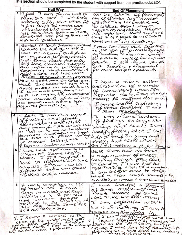 On my second placement I was on an acute, short stay unit. A number of patients there, were in need of chest physiotherapy. On one occasion, I attempted to assess a patient in the presence of my educator. The assessment went poorly. I structured the assessment inadequately and my lack of confidence lead to communication problems. My educator afterward suggested I do some work and come up with a structure that would work for me to help my respiratory assessment. From this I decided to read through some on call literature on respiratory assessment and constructed notes to help me with a structure to guide my practice. I have included my 'respiratory notes' as evidence of independently