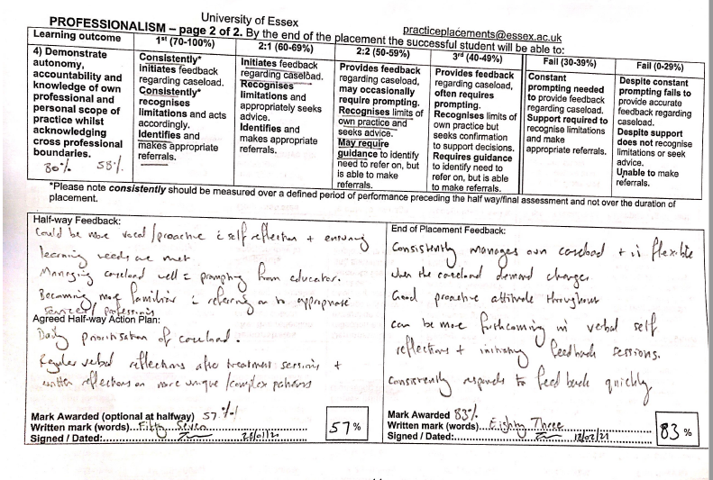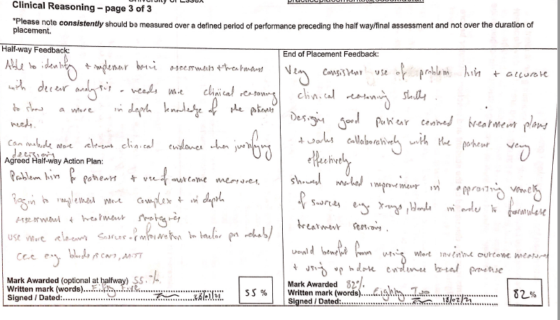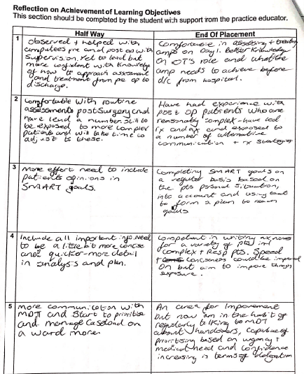 One element, I began to introduce more into my student practice was having self-awareness of learning preferences, & with guidance can identify personal learning & development needs. While quite early on in this degree, I identified that I am a practice based learner and I learn by doing (3). For me my learning preference was to get exposure to a variety of techniques while on placement and attempt to better these with practice, feedback and reflection. Echoing this, I am presenting a 'VARK questionnaire', which I completed to identify learning preferences. In terms of identifying personal learning and development needs, this is something I often found challenging during early placements. While I was aware of my limitations, sometimes I required significant guidance in identifying a solution to this. This meant creating 'learning objectives' at the beginning of placement was time consuming. However, as placements passed and I neared the end of my degree, I became much better at identifying my learning needs, and this is evident in my 'placement 5 feedback'. I believe the improvement was based off increasing my patient mileage but also increasing the frequency of self reflection. Moving into qualified practice I will need to improve this skill, as I will solely be responsible for identifying my learning needs, with some guidance given during supervision with a band 6. Therefore, before each rotation, I will complete a SWOT relative to the rotation and my goals for CPD, in order that my SOP continually progresses.