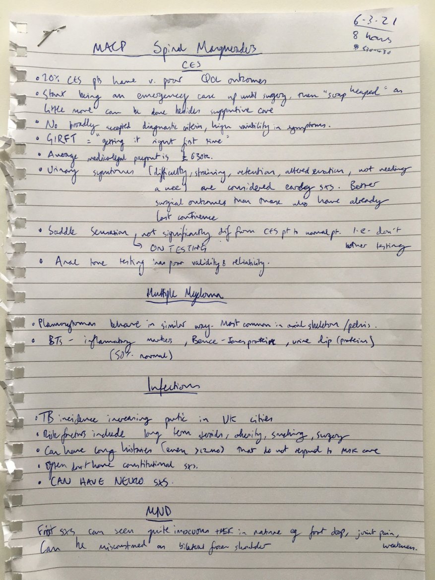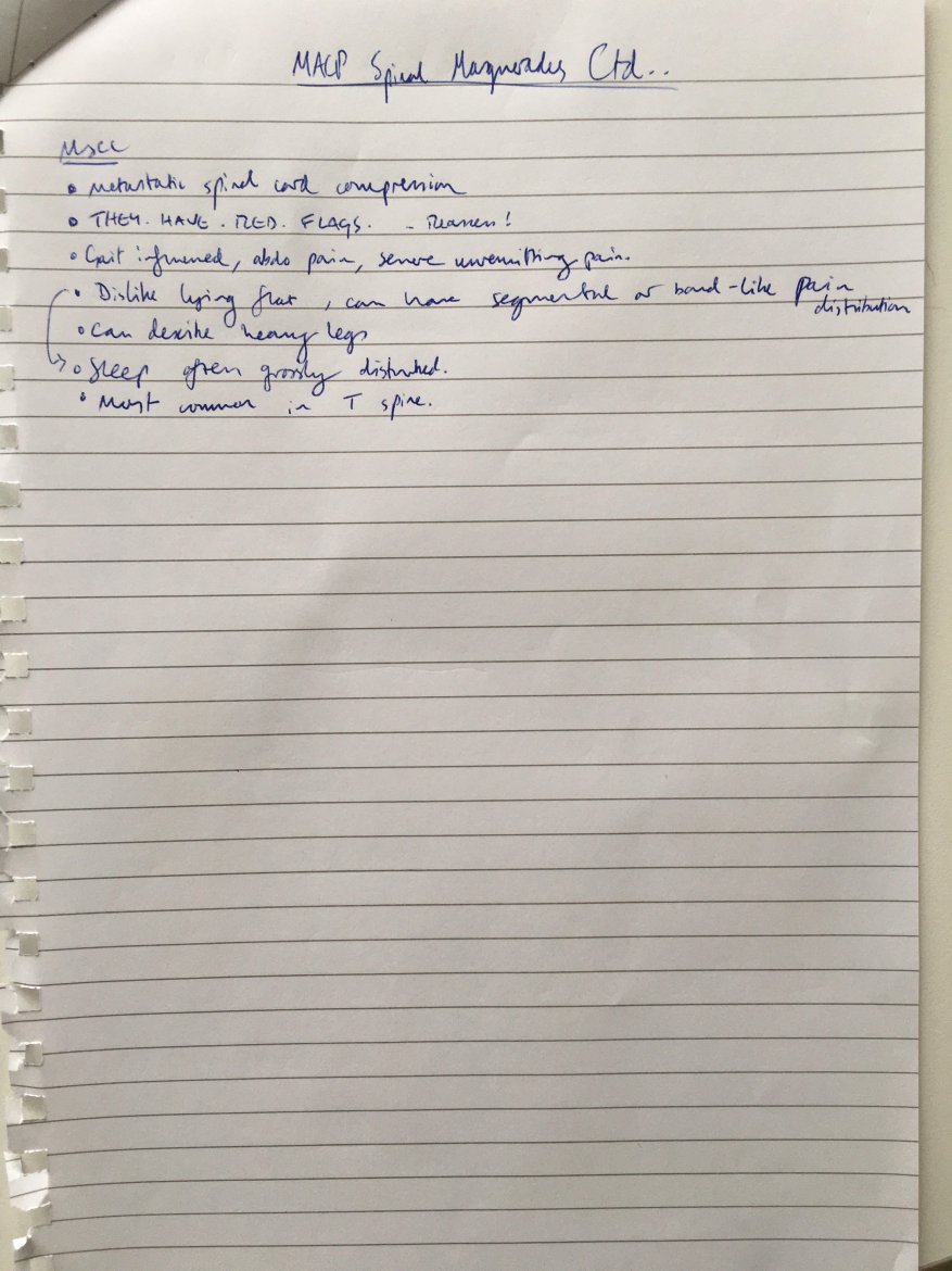 Despite this course being excellent, I must say I don't really feel any more confident in being able to recognise signs of blood cancers that mimic spinal pain. If I was in the situation where a service user had seen me as an FCP, they had spinal pain which "didn't feel right", and I thought it wasn't an infective process, I think I would most likely flounder and pass the baton on to a GP. Something which I think would give me a greater sense of security, and also prevent the consult being a waste of service users' time, would be for me to feel confident with requesting some sensible blood tests in the mean time, before booking a GP review so they had some useful results to consider during the next clinical contact. The MACP also host a course on this, which I will endeavour to get a space on to complement this learning.
