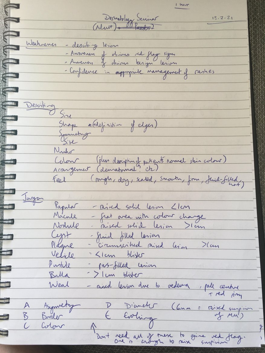 I have never felt particularly confident with skin, despite the fact that as MSK clinicians we see so much of it! I feel that if I was asked to describe a lesion at present, I could probably do a mediocre job of it. I would like to improve on this, particularly using specific dermatology jargon that makes it clear what you are describing. I also don't feel particularly confident at recognising red flag signs for a lesion, or what is obviously benign. Finally, I recognise that I have a very poor understanding on rashes, and with what level of urgency they should be referred, so would like to improve on this so as not to incur delays where red flag signs may be present.