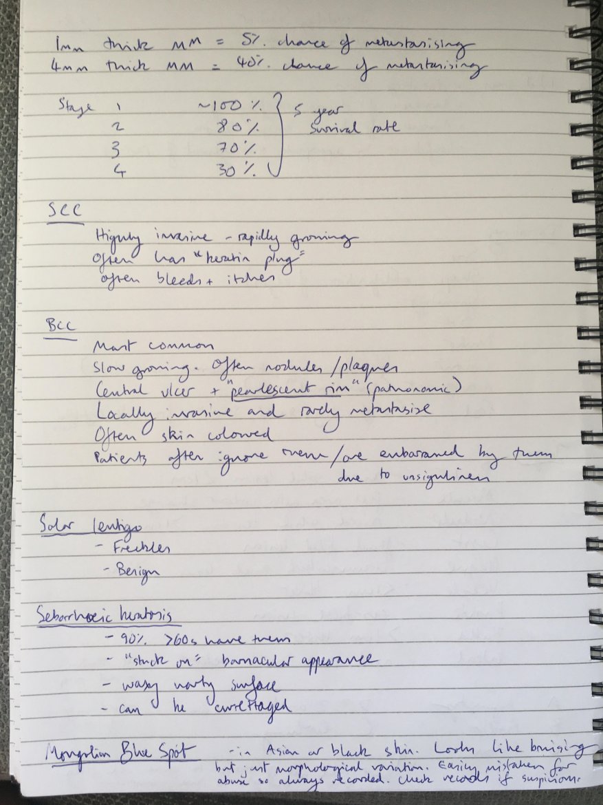 What I took away most was the importance of early recognition and treatment of skin cancers, particularly malignant melanoma, due to its high propensity for metastasising once established (40% once 4mm deep, 30% 5-year survival rate once stage 4), yet excellent outcomes if caught early (5% change of metastasising if 1mm deep, ~100% survival rate at Stage 1). I felt much more confident in my ability to recognise red flag signs of a lesion via use of ABCDEs, and looking out for signs such as keratinous plugging (squamous cell carcinoma), ulceration and pearlescent rims (basal cell carcinoma), and lesions on the palms or soles of feet (malignant melanoma).