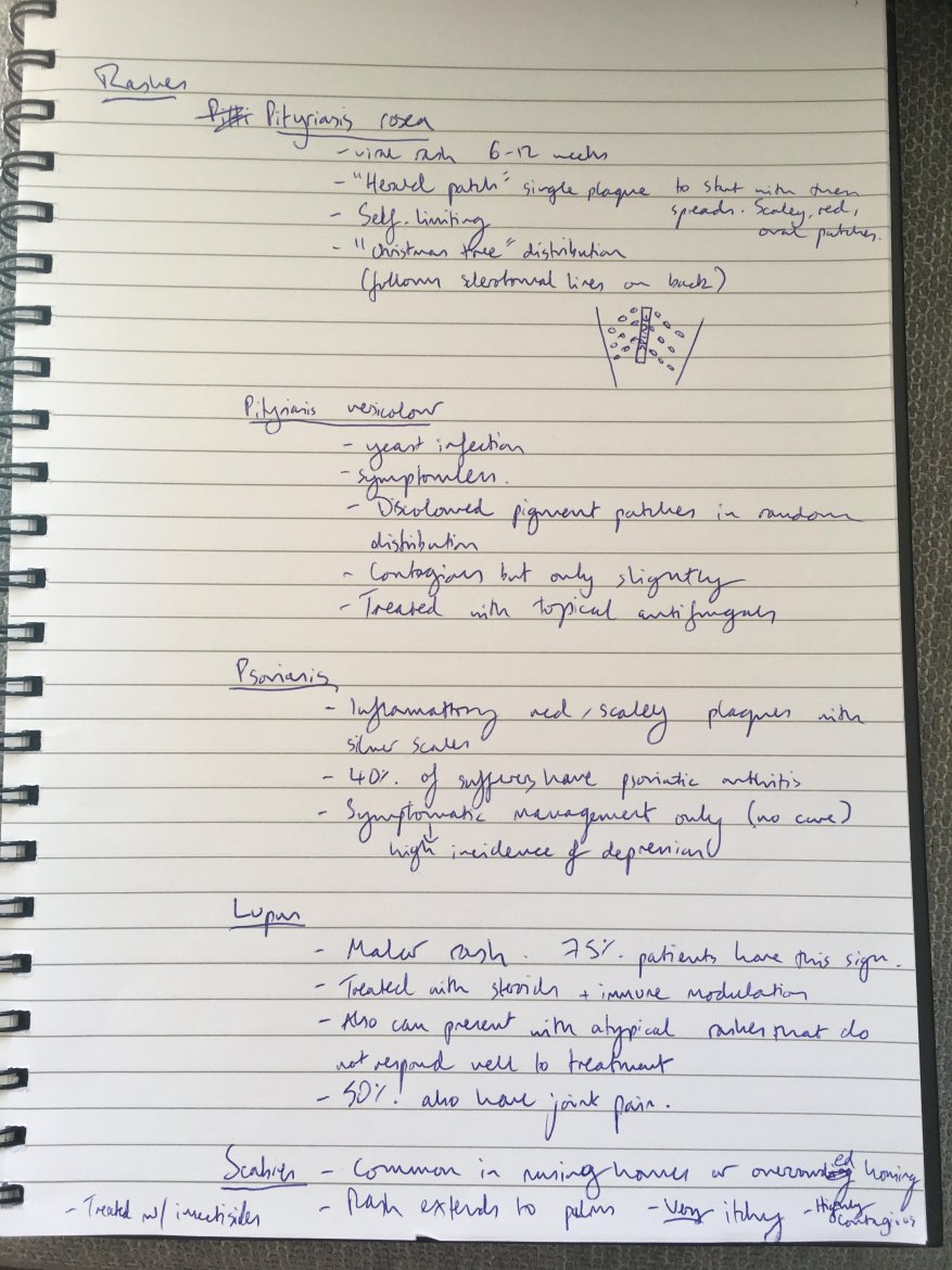Whilst we did cover some common types of rashes, I must be honest in that I still don't feel particularly confident in being able to distinguish a benign rash from one that requires further clinical attention. I feel that I could recognise scabies, shingles and non-blanching meningeal rashes, but apart from these I do not feel I would have any confidence if one presented, and would likely have to seek help from colleagues.