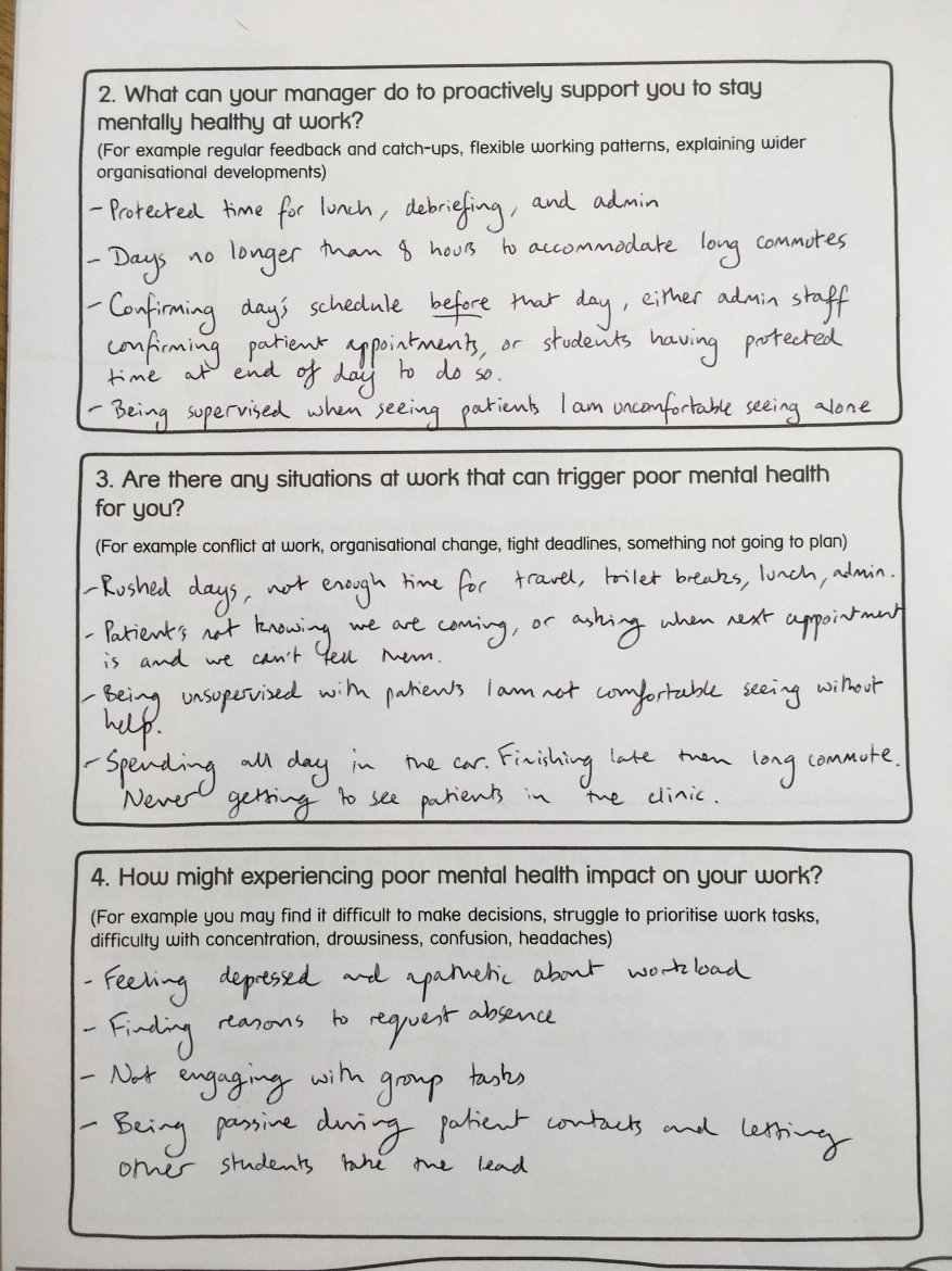 In order to strike the correct balance, I would need to empathise with the needs of the clinic, recognise how my own needs might conflict with these, and suggest a compromise somewhere in the middle to create a win-win situation. With this new way of looking at the stress I had faced over the first week of the placement, I used Mind.org’s Wellness Action Plan as a template to identify my stressors and offer realistic solutions for how to resolve them, keeping in mind the clinic’s need for me to continue seeing patients at the same volume. For example, I realised that two of my major stressors were having no breaks, and feeling unsafe due to not being supervised whilst seeing very frail or complex patients. In the Plan I offered a solution of protected time for breaks and debriefing sessions, recognising that in-person supervision is not always practical for the clinic.