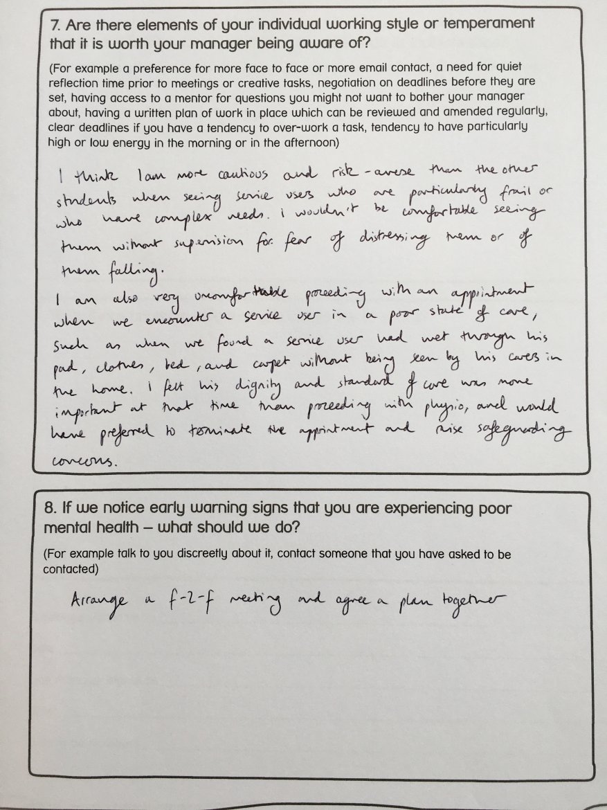 By going through this process I feel better able to recognise my own workplace stressors, explore how they could be managed, and negotiate realistic strategies to ameliorate them that would not compromise the needs of my employers. I feel that these skills will help me to cope with the rest of this placement, and could also be used to cope with stressful workplace events in future