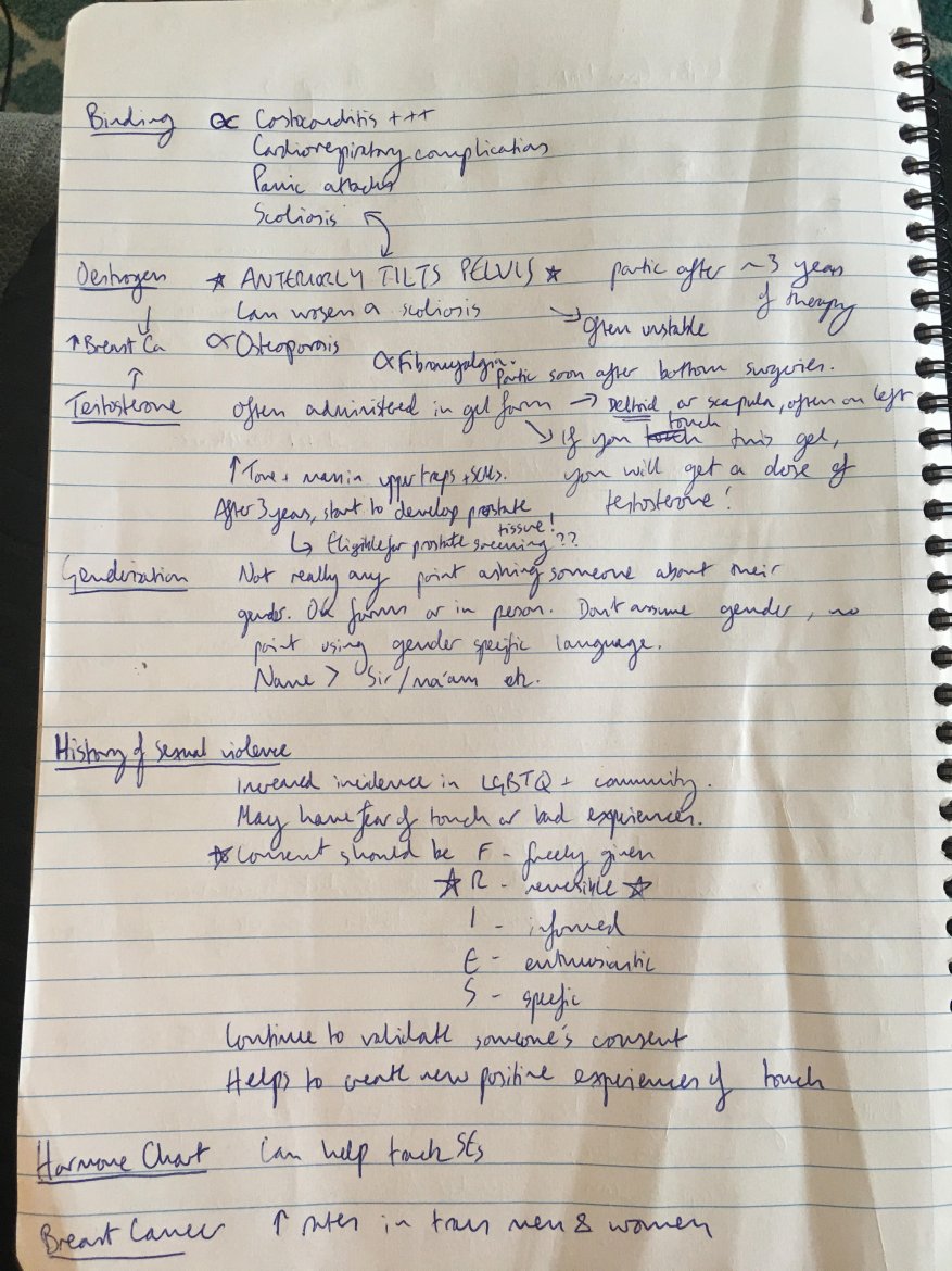 I don't have much experience of seeing trans people in clinic, but can recall one particular trans man who came to see me several times and we ended up building good rapport. We spoke about skin being taken from the medial surface of his forearm for the purpose of his gender affirming surgery, but I wasn't aware at all that he may have had tissue taken from his latissimus. I wonder now if this may have had any influence on his upper back pain. Sadly I won't see him again as I no longer work in the same catchment, but will take this knowledge forward as a consideration for any future patients I meet who may have had surgery using latissimus tissue.